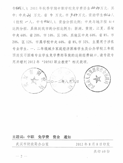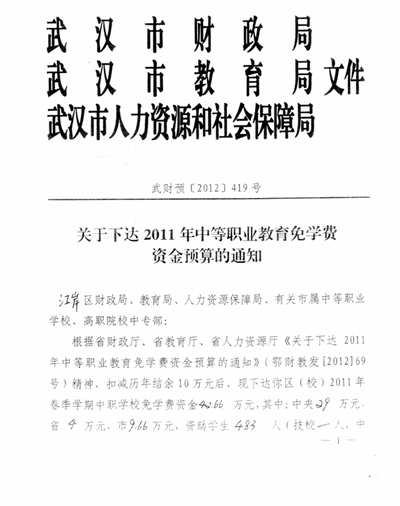 根据省财政厅、省教育厅、省人力资源厅《关于下达2012年春季学期中等职业教育免学费资金预算的通知》(鄂财教发[2012]88号)精神,现下达你区(校)2012年春季学期中职学校免学费资金40.02万元,其中:中央27万元,省4万元,市9.02万元,资助学生451人(技校 人,中专451人)。资金分担比例:中央与地方按6:4比例分担,具体到我市的分担比例为:新洲、黄陂、江夏、蔡甸中央60%,省20%,市10%,区10%,其他区中央60%,省8%,市20%,区12%,市属学校中央60%,省8%,市32%。主要用于涉农专业学生,一、二年级城乡家庭经济困难学生及公办学校三年级顶岗实习困难专业学生免学费而导致的运转经费缺口。中央补助收入请列入110类“转移性收入”、02款“一般性转移支付收入”、21项“教育转移支付收入”科目,通过2012年财政年终结算办理。支出请列2012年“20503职业教育”相关款、项,并专款专用。