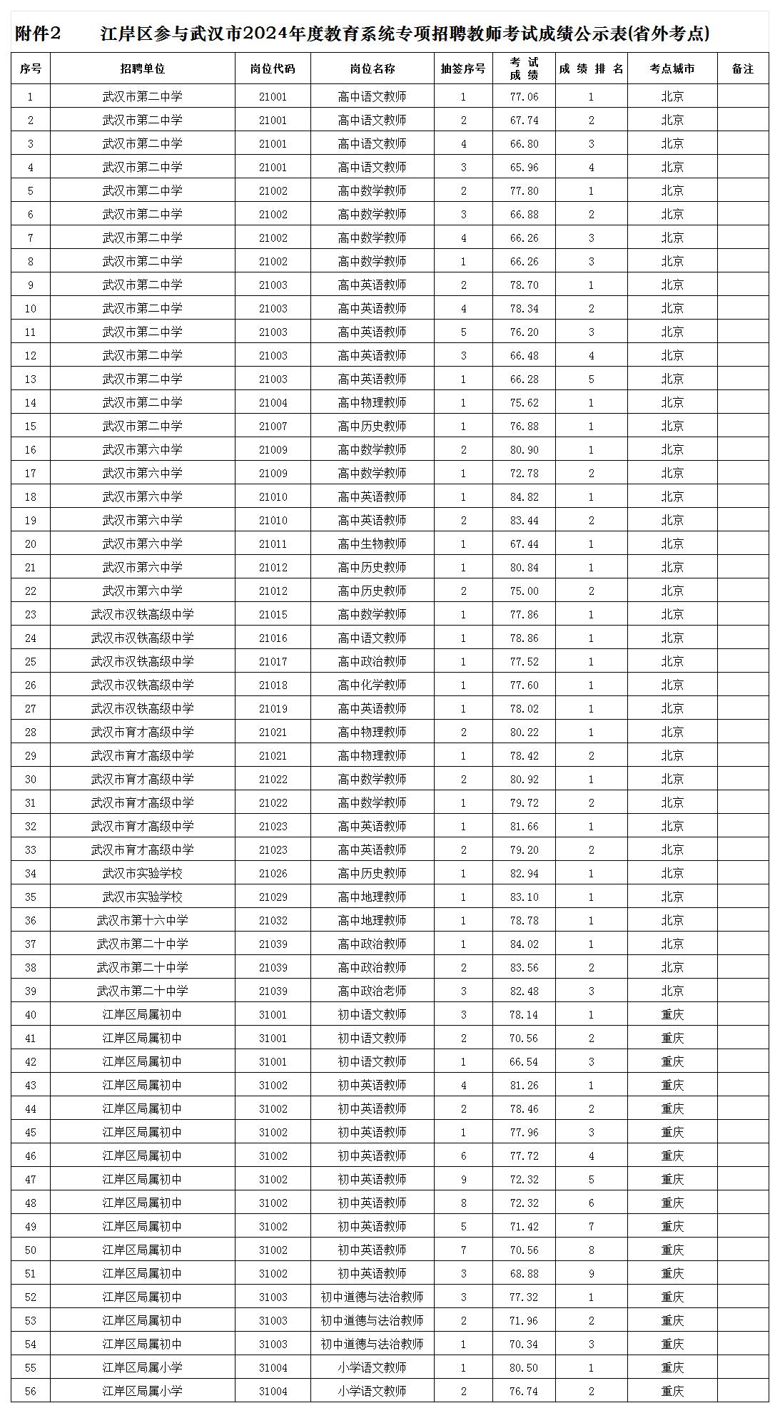 2.蜜桃视频 参与武汉市2024年度教育系统专项招聘教师考试成绩公示表(省外考点)