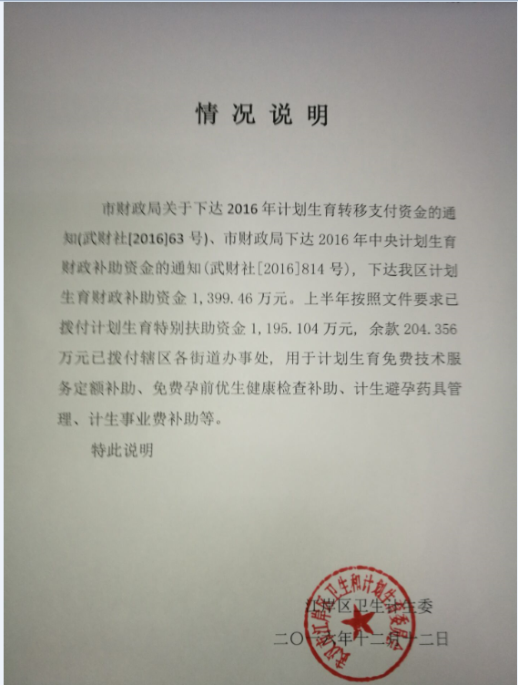 关于上级下达计划生育补助资金使用情况说明