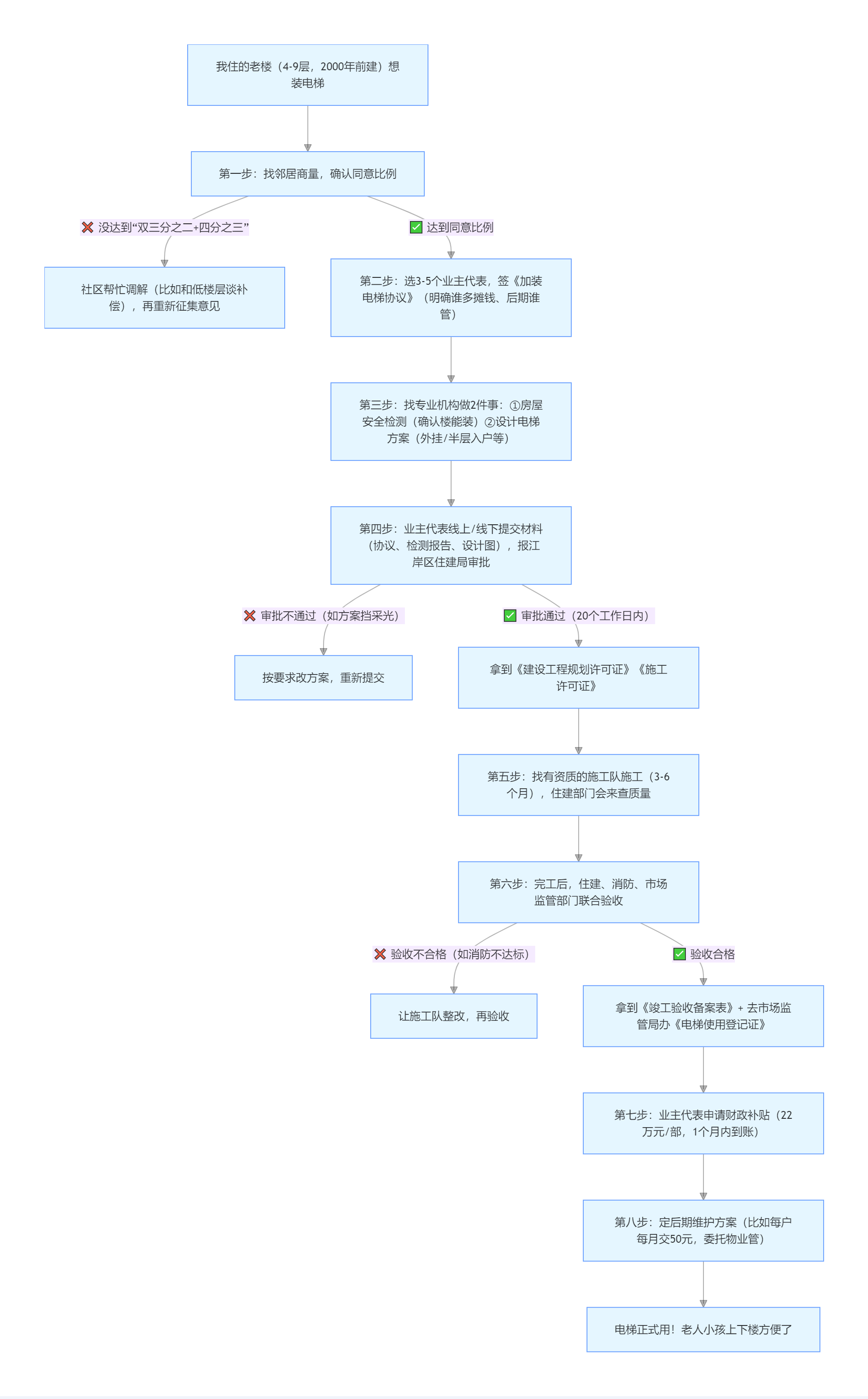 答:社区可组织 “邻里协商会”,邀请街道、律师参与调解;若仍无法达成一致,可暂缓申请,待多数业主同意后再启动;不得强制加装(如堵门、闹事),否则可能被投诉。