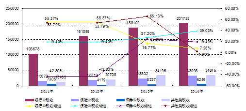 从分行业纳税情况来看,银行业依然是税收贡献大户,2014年完成税收20.17亿元,同比增长7.25%,占金融业税收的比重为73.11%。保险业税收增长率稳步提升,2014年完成税收3.31亿元,同比增长39.03%,增幅比上年提高约12个百分点,占同期金融业税收的11.99%。证券业受“十二五”初期股市低迷影响税收降幅明显,近年来增幅回暖,2014年税收达到6246.37万元,同比增长19.49%。其他类金融机构、新兴金融企业数量逐步增多,税收增长较快,税收贡献度进一步提升。