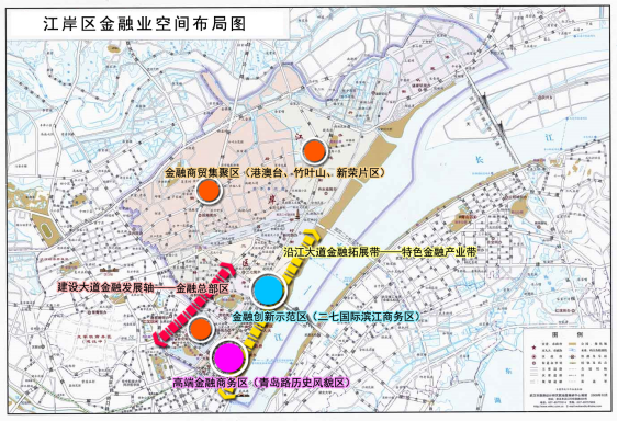 以沿江大道为拓展带,依托沿江商务区、二七滨江商务区等金融业重点功能区,将沿江大道金融发展带打造成为集金融商务服务、新兴金融业态、金融中介咨询和产业金融服务于一体的特色金融产业带。